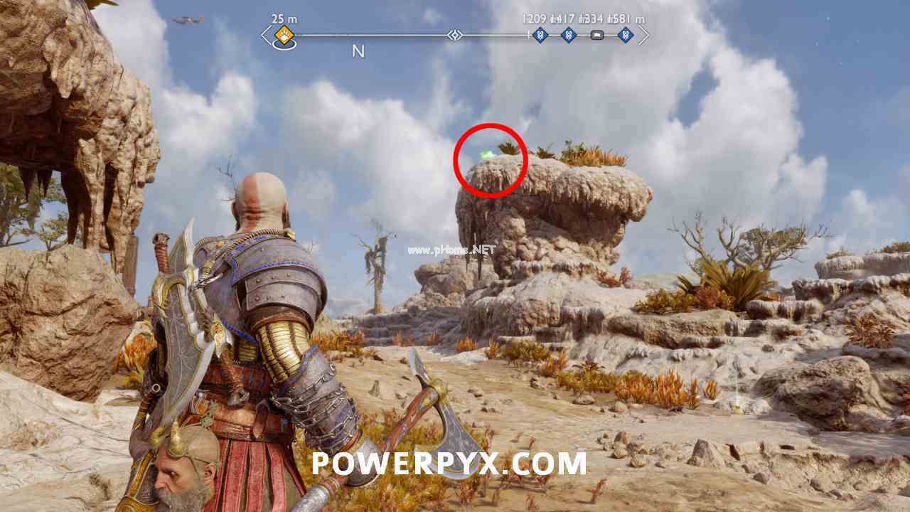 #3 – 三女神宝箱 相同的区域,诺尼尔宝箱是在从神器所在的岩石上掉下来之后。但首先你必须摧毁 3 个封印,它们看起来像岩石,上面有蓝色发光的字形,扔给你斧头摧毁它们。第一个是在神器所在的山上。第二个是在一个小岛上的诺尼尔箱子后面。第三个是在胸部右侧的一块小石头上。下图的所有 3 个字形都用红色圈出。摧毁所有 3 个后,您可以打开宝箱。 ![]()