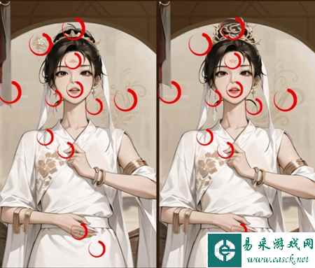 《离谱的智商》天欢找茬通关攻略过关要求:找到12处不同的地方。 具体线索:指环、发簪、额纹、口红、汗毛、耳饰、头发丝、头饰、帘子、花纹、衣痕、指甲。 图解:找不同的关卡需要有耐心,有很多地方的差别比较细微,例如口红的颜色其实是有差别的。