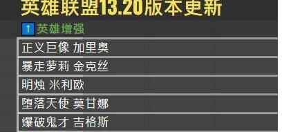 lol13.20一、英雄增强 1、正义巨像 加里奥 W冷却时间:18/17.5/17/16.5/16秒→18/17/16/15/14秒 护盾刷新时间:12/11/10/9/8秒 2、暴走萝莉 金克丝 成长生命值:100→105 被动攻速加成现在可以叠加 R冷却时间:75/65/55秒→70/55/40秒 最小伤害:30/45/60(+15%额外攻击力)→32.5/47.5/62.5(+16.5%额外攻击力) 最大伤害:300/450/600(+150%额外攻击力)→325/475/625(+165%额外攻击力) 3、明烛 米利欧 被动燃烧伤害现在会算作米利欧的伤害(不会抢人头) E充能时间:18/17/16/15/14秒→17/16/15/14/13秒 护盾值:60/85/110/135/160→60/90/120/150/180 R治疗效果法术强度加成:30%→50% 4、堕落天使 莫甘娜 W法术强度加成:14%→17% 对野怪的伤害:155%→165% E冷却时间:24/22/20/18/16秒→26/23.5/21/18.5/16秒 R现在无论朝向哪个方向都会有额外移动速度 额外移动速度:5/35/55%→10/35/60% 技能伤害:150/225/300→175/250/325 法术强度加成:70%→80% 晕眩时间:1.5秒→1.5/1.75/2秒 5、爆破鬼才 吉格斯 Q碰撞范围:150→180