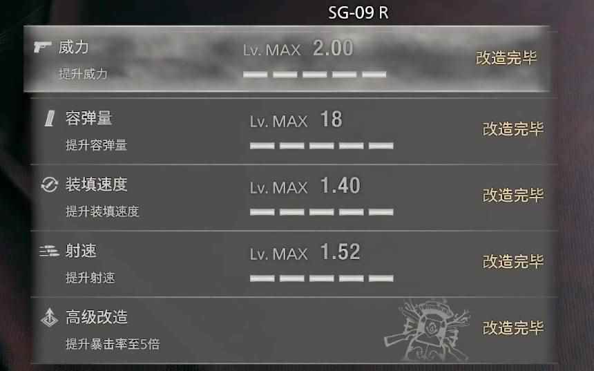 2.调校 普通改造:SG-09R可以在威力、容弹量、装填速度和射速四个方面进行改造,每个改造方向都可以升级5次。 高级改造:SG-09R可以进行高级改造,其效果也是非常简单粗暴,可以提升五倍的暴击率。 推荐方案:对于近距离手枪来说,其实最重要的就是威力,其次就是它的射击速度,因此推荐大家优先升级SG-09R的威力和射速,然后再升级剩下的两个,直到高级改造。