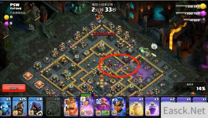 3、在部落援兵接近弓箭女皇时使用伤害药水法术和狂暴法术,并放置弓箭手和法师。同时在12点方向右侧放下隐秘哥布林清边。等弓箭女皇打完援兵就会自动从缺口处清理上方建筑。