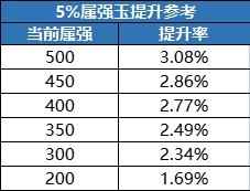 [词条加成解析] 攻击强化玉会随着特色的提高,提升率下降,但是总体比例还是在1:3左右, 对于特色不够齐全的小号,可以选择攻击强化玉会有更高的性价比。 以5%攻击强化辟邪玉为例,3技攻玉提升为5.68作为基准,提升率对比参考