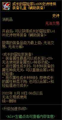 需要介绍的是本次新增的[成长的冒险家]系列装备,通过升级任务可以获得除武器外全套。 [成长的冒险家]系列装备1/2属性固定为7%技能攻击力与10点全属性强化,3/4属性则是一些附加属性。 [成长的冒险家]最多可成长至20级,属于过度用105级史诗。