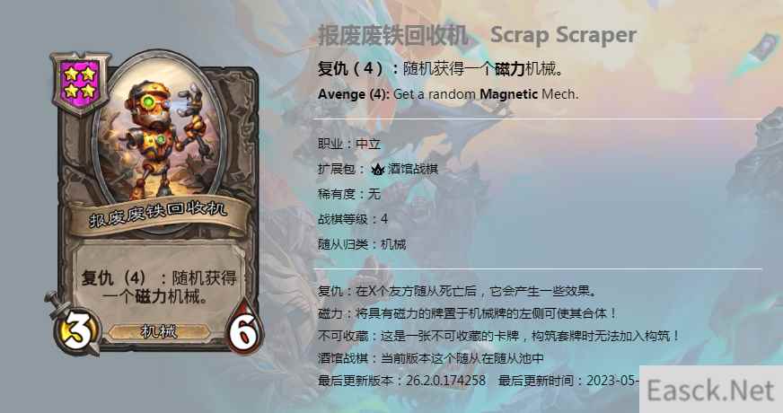 炉石传说酒馆战棋近日更新了26.2版本,此次上线了全新的酒馆战棋的新英雄和新随从,很多玩家都想知道炉石传说酒馆战棋新随从报废废铁回收机怎么样?下面我就给大家带来详细介绍,一起来看看吧! 新随从报废废铁回收机4星3/6机械,复仇(4):随机获得一个磁力机械。