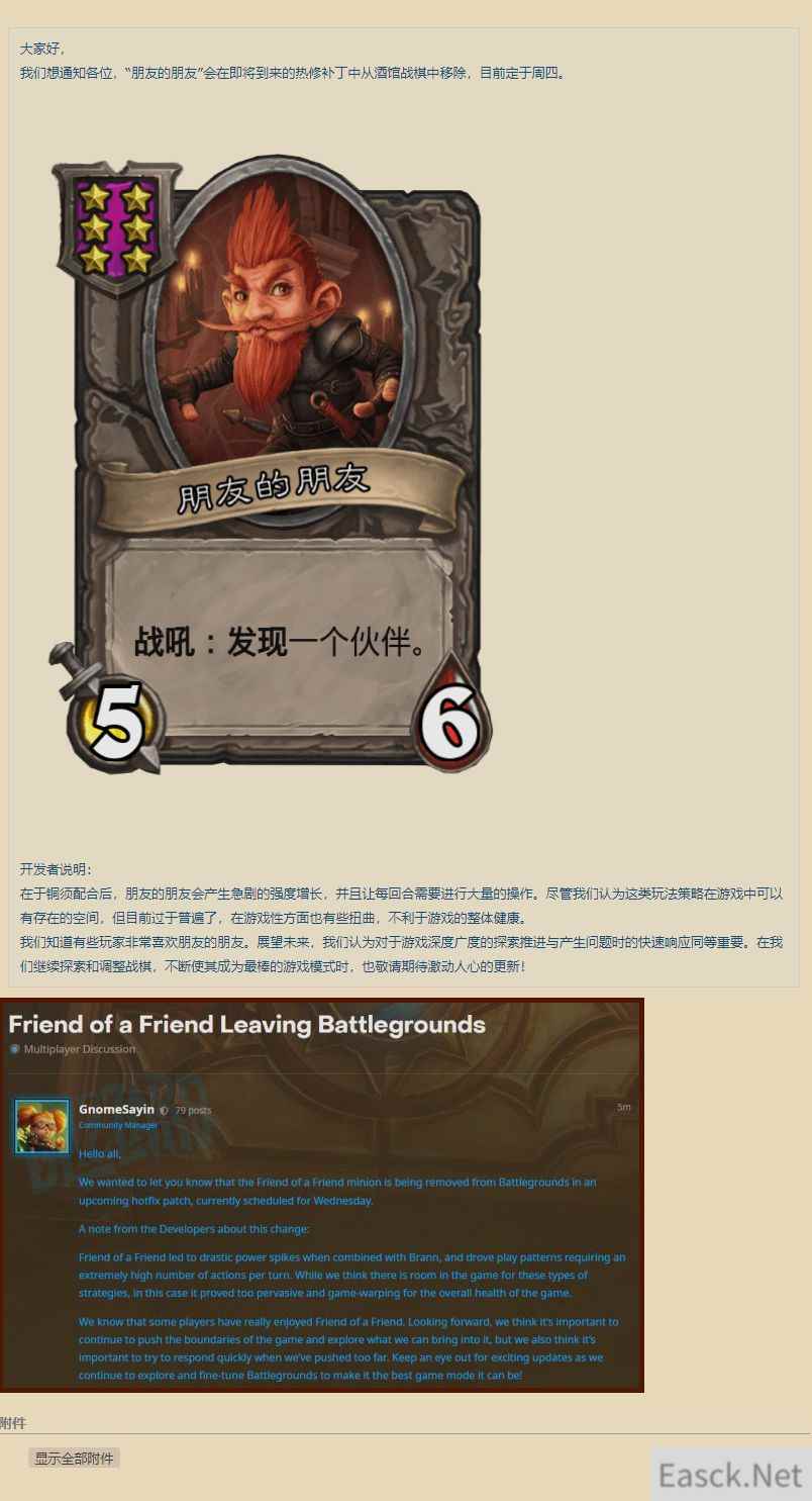 朋友的朋友配合铜须能引发急剧的强度爆发,从而使游戏变得每回合需要进行极多的操作。虽然我们认为这种形式的玩法在游戏里是可以有一席之地的,但现在的情况是它太泛滥、太决定游戏走向了,不利于游戏的长远健康。 我们也知道有些玩家玩朋友的朋友是很享受的。所以未来我们觉得还是要去不断地去突破原来的界限,去探索我们还能推出什么;而与此同时,我们也要在太过了的时候进行更及时的反应。敬请继续关注未来的更新,我们会对战棋继续探索和优化,把这个模式做到最好! |