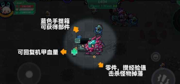 3.、其他设施: 宕冢中有许多废弃的建筑,这些建筑既是你行进时的障碍物,也可能让你躲避敌人的弹幕。在行进中,你还会遇到等待营救的同伴。牢笼打开后,获救的机甲队成员会花费一段时间修复机甲,之后会作为同伴作战一段时间。 在修复期间,会有怪物涌来攻击机甲,血条清空则机甲毁亡。 4、可获取的资源: 【零件】:击败敌人会掉落零件,在一定范围内的零件会自动拾取; 【宝箱】:地图上散布着许多宝箱,部分怪物击败后也会掉落宝箱。从中可以开出机械臂、部件(蓝色手提箱)、血瓶等资源。