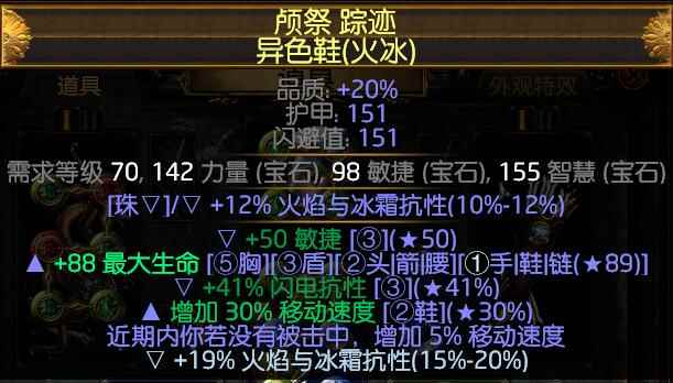 属性要求:必要50+敏捷和生命,攻速抗性要求不高,有能力的可以找冰缓增伤会比我这个略强一点。 鞋子