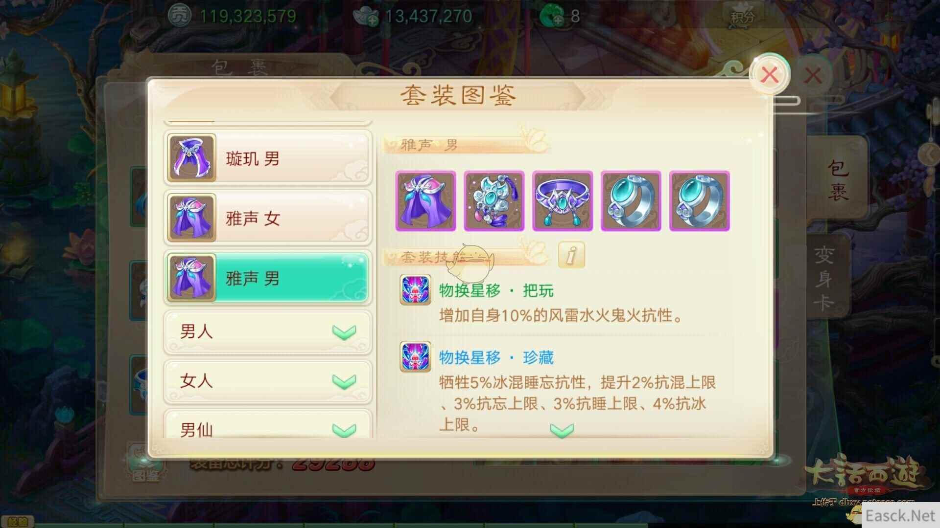 推荐职业:女鬼,男鬼。 雅声珍藏套: 雅声套的作用就是为增强抗性和提升抗性上限的,它的作用也不仅仅只是对男鬼来说的,除了人族之外,其他职业的原始上限抗性相对来说比较弱,都只有100,而对于大众玩家来说帮派修炼肯定不会特别高,目前逍遥的帮派修炼都还没到65,所以这个时候每一点抗性或者每一点抗性上限都是弥足珍贵的,尤其是对血单位来说更是如此,如今一些高中端副本的怪物的控制还是非常逆天的,反正逍遥的男鬼在抗130+带盘的情况下也是被控的不要不要的,所以雅声珍藏套也是一个不错的选择。但是同样的雅声也是移山套,获得难度上会高一点。