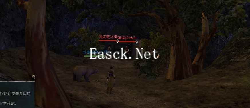 沿着箭头的方向一直游过德拉万湖,上岸之后我们会发现一个很隐秘的山洞,门口还有三个强盗守卫。
