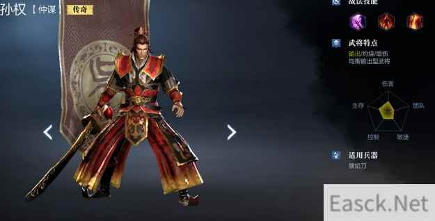 在游戏里孙权的定位是均衡输出型的角色,有输出,增伤和灼伤的特性,专属兵器是狼焰刀,武将战法有三个,第一个是君威,让孙权的战斗力提升,第二个技法是火炎计,让孙权战斗中可以附带有灼烧的技能伤害;第三个技法是火上浇油,孙权的EX技能命中了带灼伤伤害的敌人,就可以延长灼伤的时间;孙权的五维图上也可以看出,他的各项特征非常均衡,单挑出站也没什么大问题,综合性较强,战法全部提高输出,专武也能提升攻击力,可以说是用起来割草非常爽快的角色了。