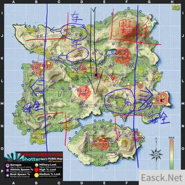 红色标记的圈是人多的主要搜点,黑色标记的圈是打野的主要搜点