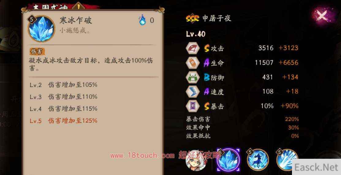 2、2技能 渊冰三尺:敌方被施加冰冻效果时自身爆发寒气进入水行昭神的姿态,效果持续2回合。 水行昭神状态下,攻击有10%基础概率施加冰冻1回合,对冰冻类效果的敌人攻击次数翻倍,其他友方施加冰冻效果时额外对目标造成1次伤害。