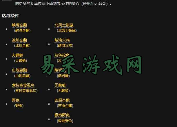 魔兽世界中有着许许多多的成就,今天给大家带来的是陪伴我成长的小松鼠们成就成就,相信很多小伙伴们不知道陪伴我成长的小松鼠们成就怎么完成,那么小编给大家带来具体完成方法。 魔兽世界14天游戏时间免费领取地址:点击查看 陪伴我成长的小松鼠们成就攻略这个成就需要向以下小动物施放/LOVE 示爱动作 •极地野兔•北风土拨鼠•峡湾企鹅 •峡湾火鸡•冰川企鹅•灰色松鼠 •大蟾蜍•熔岩蟹•山地臭鼬•无赖蛙 •索拉查食虱鸟•苔原企鹅•野兔 先告诉这些企鹅的位置 就是各个大陆的海边浮冰 TOC北面的海上浮冰有冰川企鹅 苔原做钓鱼日常断臂的地方有苔原企鹅 嚎风峡湾有很多东西 企鹅 在海边 火鸡在地图中央的一个丘陵上 多得很 附近有山地臭鼬 主要是 好多小动物看名字也能知道个大概位置 比如 索拉查食虱鸟 建议你一起做四个成就:我起爱的小松鼠们 伴我成长的小松鼠们 控制虫害 火鸡终结者 杀峡湾火鸡就可以完成 无赖蛙在嚎风峡湾LM港口营地 外面活动 网上给出的固定坐标只能表示收集坐标的人在那里看到了目标而不能说一定是那里 跑成就这种事别急 慢慢来 早晚能跑到8000的