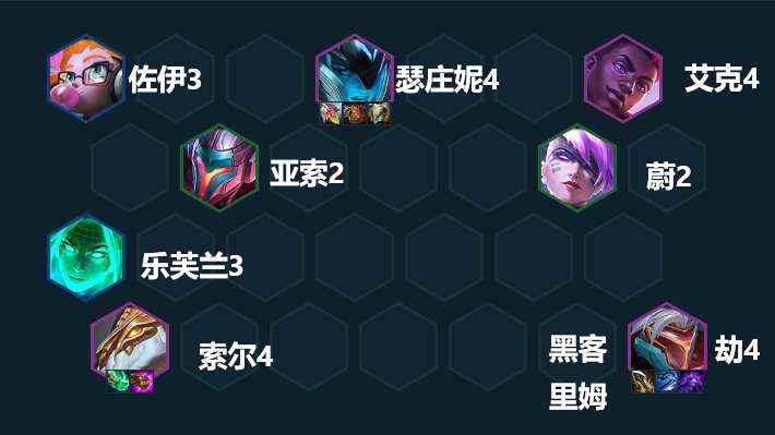 后期成型 7-8人口,我们需要找到我们这套阵容的主C劫和主坦猪妹,并且补上佐伊和乐芙兰为劫开出3黑客羁绊,牛头可以先下了。成型之后我们的站位是龙王、妖姬沉底。佐伊和艾克有淘气包羁绊,所以让他们在左上角和右上角吸引一些边角火力。主T瑟庄妮在第一排中心吸收对方的主要输出。亚索和蔚在第二排,避免第一时间吃伤害暴毙,为团队打出更多控制和破甲效果。