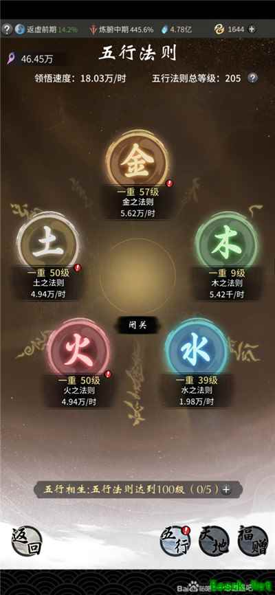 由图可见,每项五行法则都有达到各个50级领悟速度赔率*2的效果,那么,最优先吃资源要达到的,就是先开启一种法则至50层,而后转向另一项法则,五项法则全部50后,再按套路开启一轮150层的点法,也即是平均分配法
