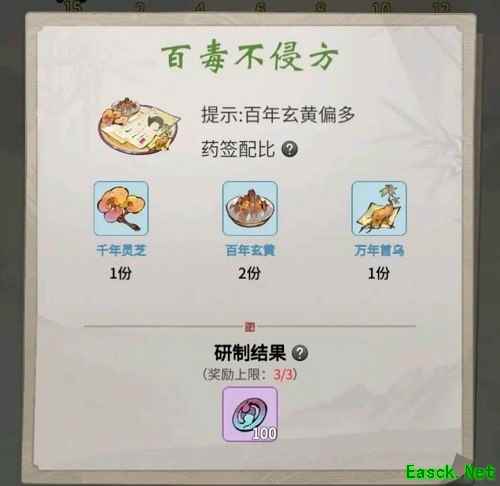 百毒不侵方 千年灵芝1 百年玄黄2 万年首乌1 功法点100