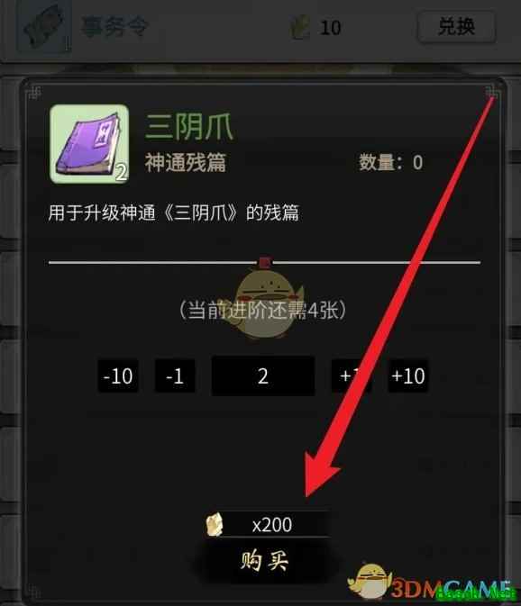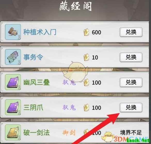2、接着在藏经阁页面,找到三阴爪的神通残篇点击兑换;