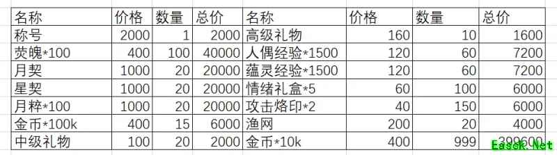 1、称号;荧魄;金币;星契;月契;月粹,合计:108000(十万八千)代币;