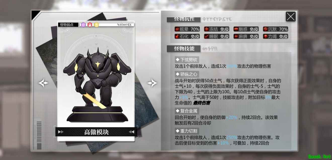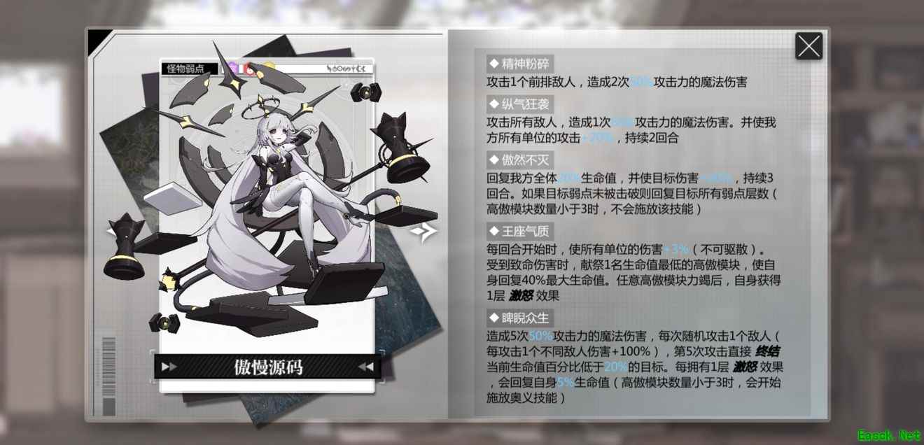 高傲模块不死,傲慢源码则不会死亡,高傲模块大于2时傲慢源码会群体回血和恢复弱点层数,小于3则会高频率释放奥义【睥睨众生】,还可以斩杀血量低于20%的人偶,同时还会恢复自身生命值,没有【嘲讽】的话,相当难扛住。