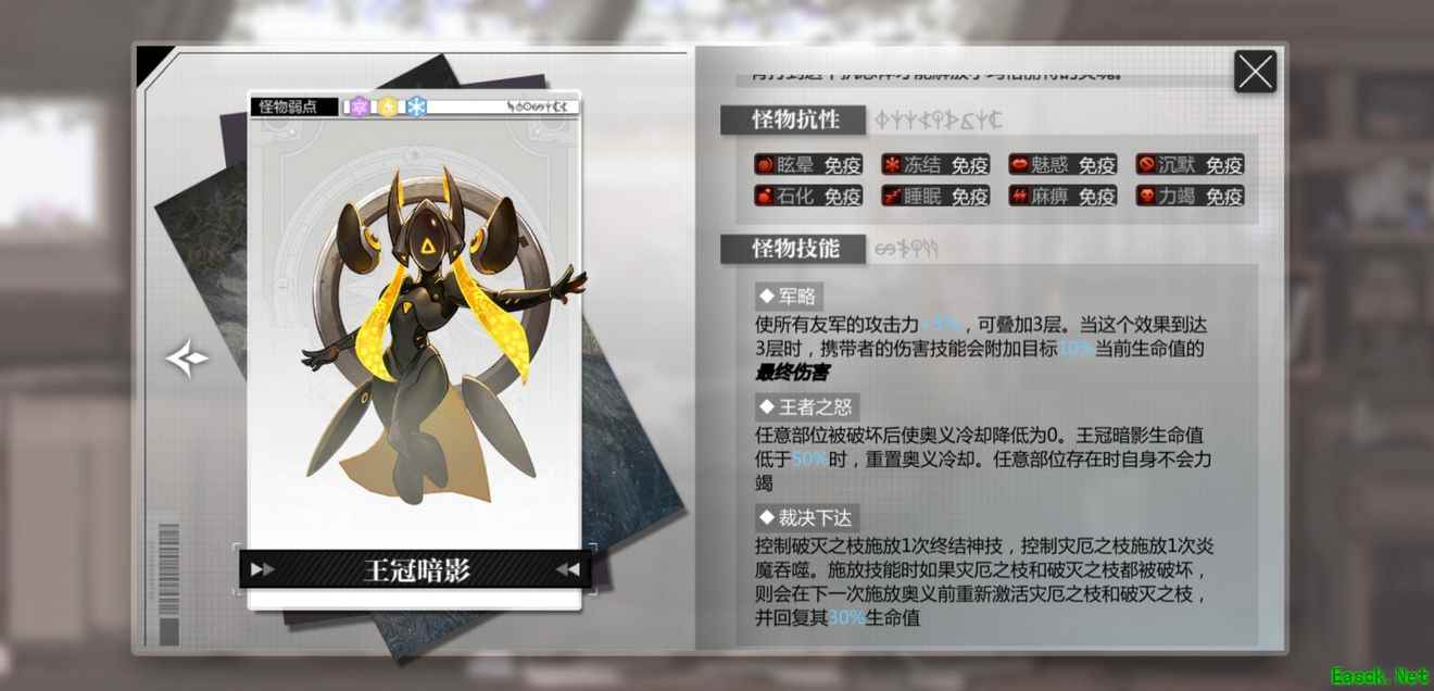 伤害很高,并且生命低于50%时会冻结我方所有人偶,所以在50%血线时注意让主C优先出手;之后每个回合都免疫前两次伤害,需要破盾手和辅助先垫刀,之后主C再输出,类似星见亚砂的核心技能能攻击两次的人偶也是不错的选择。