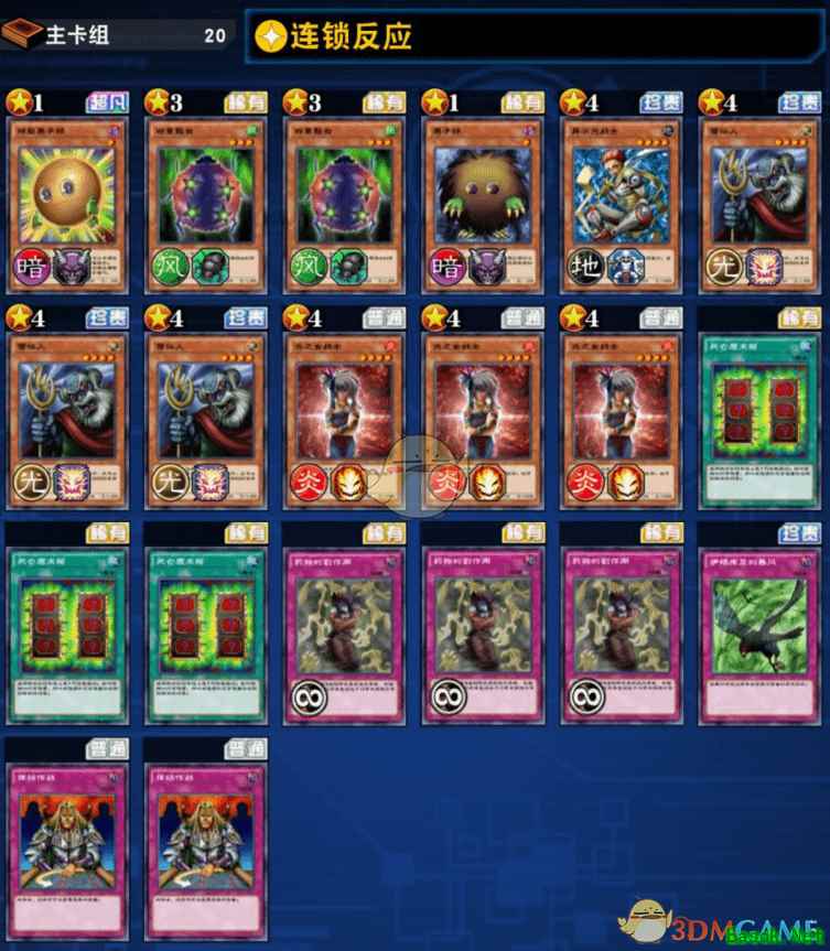 注意雷仙人被魔术箱放到对面时,如果自己的怪兽攻击高于1300,打死了雷仙人自己会扣5000血,要用低攻击的,也可以带针球换下女战士(1000伤害,攻击小于1300,这样连锁反应都不用带,换生命值增加α加强苟命)卡组不是固定的,如果不是没钱,谁不想拥有3个球形栗子球呢,我还带了普通栗子球QAQ,甚至针球也不是必须的,可以带一堆陷阱卡苟过去,5张陷阱卡配合连锁反应打1000伤害就行。