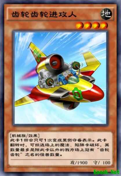 虽然是机械族,且有着四星1900的打点,但并不适合投入机甲卡组作为机甲的新玩具(原谅我看见机械族第一反应就是能不能搭配机甲)。自身可以在翻转时不取对象破坏除它以外数量齿轮齿轮怪兽的魔法陷阱卡,只能配合其余齿轮怪兽使用。