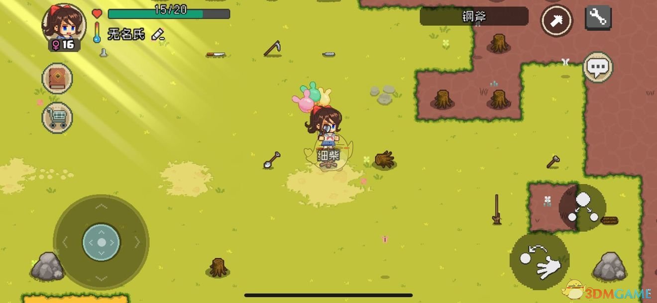 角色手持钢斧走到树棍、木柴和树桩处,可以将其砍成细柴。