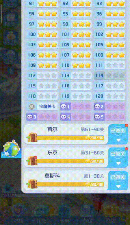 环球之旅主题活动目前开放了莫斯科、东京、首尔、北京、开普敦等18个城市。每个国家分别有30个普通关卡和5个密室关卡,总计540个普通关卡和90个密室关卡,让你根本不用担心关卡不够玩。