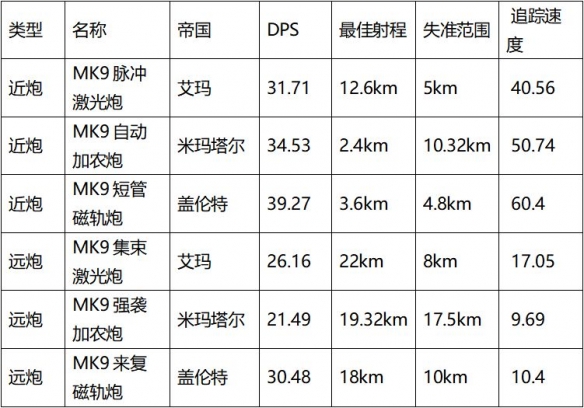 希灵帝国的激光炮在中型火炮的对比中,我们不难看出,艾玛帝国的伤害较为平庸,其远炮与近炮之间的差异也没有其他帝国那么大。最主要的还是激光炮的追踪速度,即使是近炮的追踪速度也仅有40.56,这就导致大部分艾玛的巡洋舰难以进行近身肉搏战,或许是因为这一原因,艾玛帝国的舰船在速度上略微快于盖伦特的舰船。