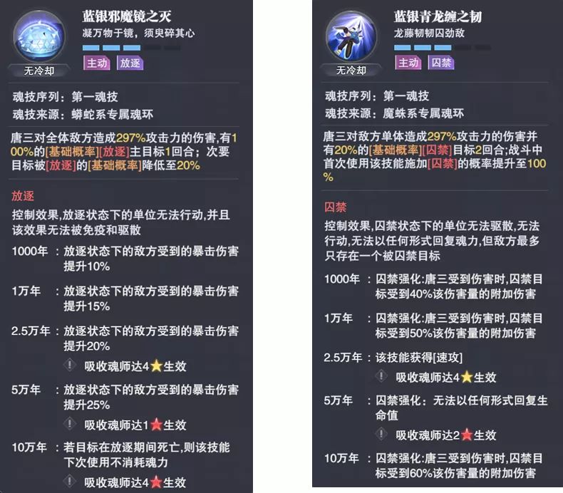 从上面两个技能的功能来看,这两个技能都属于强控技能,其中【蓝银邪魔】更倾向于全体1回合控制的效果(主目标高概率,子目标低概率),而【蓝银青龙】则是更倾向于单体2回合控制的效果(首次使用高概率,后续使用低概率),两者中【蓝银青龙】的【囚禁】效果更为硬霸,但【放逐】效果重在可以概率群体施加,所以这两个技能在不同环境下是有区别的,不能一概而论谁一定就比谁强。