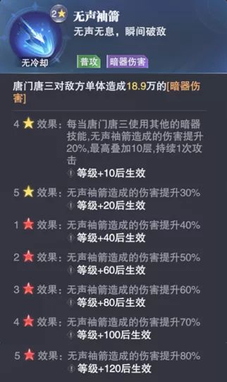 【无声袖箭】是一个单体的普攻伤害,暗器升星后的效果为提升普攻的伤害,并且唐门唐三在使用其他暗器技能时也能提升无声袖箭的伤害,最多可叠加至800%,不过只能持续1次攻击......
