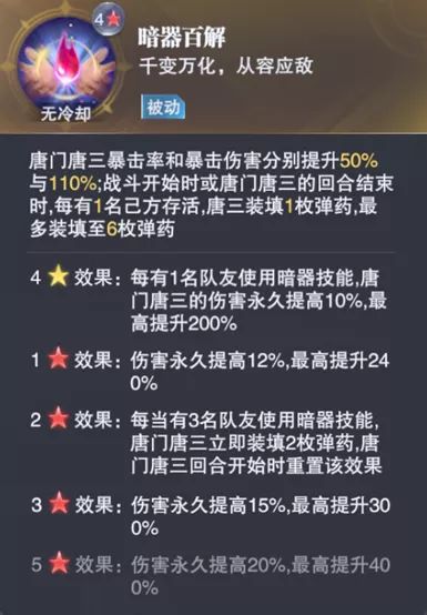 来看看唐门唐三的技能,他的技能包含了一个暗器百解效果+3个技能,其中暗器百解的效果会根据唐门唐三的星级提升而发生变化: