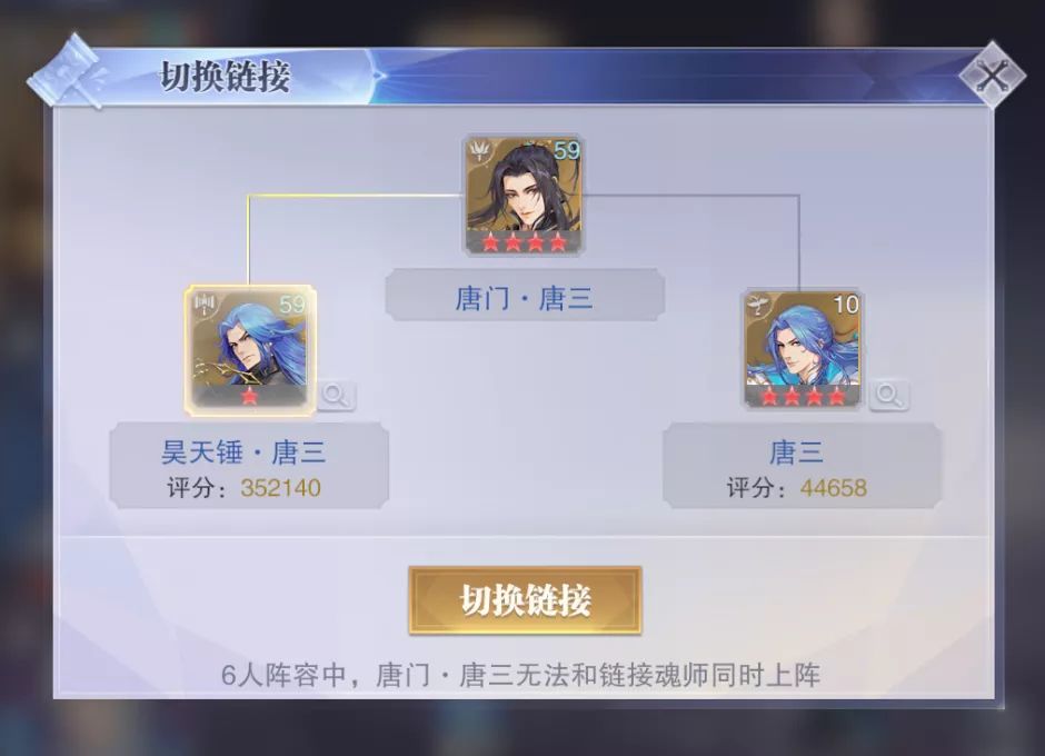 唐门唐三的升级是会链接到两位额外的唐三身上的,分别是锤三和草唐三,所以唐门唐三其实并不需要我们额外投入资源去升级,只需要链接到之前的两位唐三身上即可,另外上图中我的锤三其实也是链接到胖子身上的,相当于唐门唐三是一个二次链接的状态,这个也是游戏中的首创。