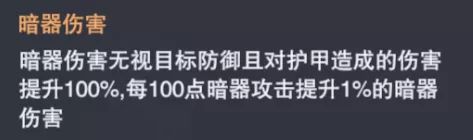 然后唐门唐三的属性中新增了一个叫做暗器攻击的属性,这个属性和下图中的暗器伤害会有一些关联,其中暗器伤害可以无视目标防御(相当于完全破甲),同时对于拥有护甲(护盾)的伤害提升100%,这也是这个全新的暗器攻击给游戏所带来的一些小小的新变化。