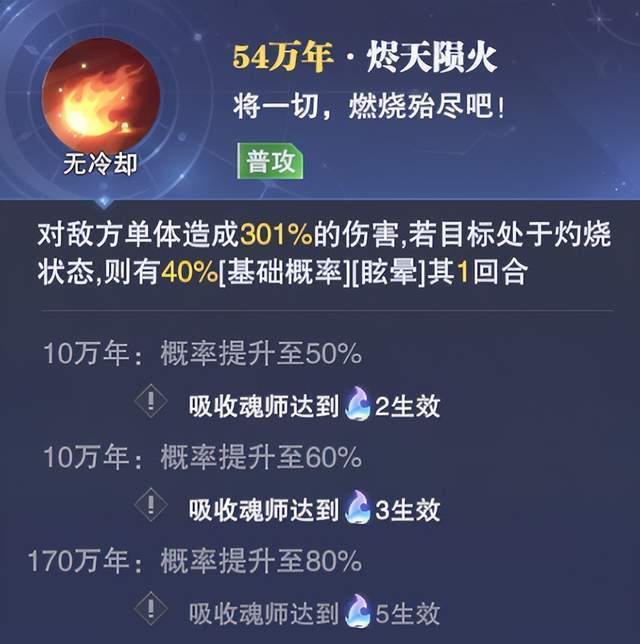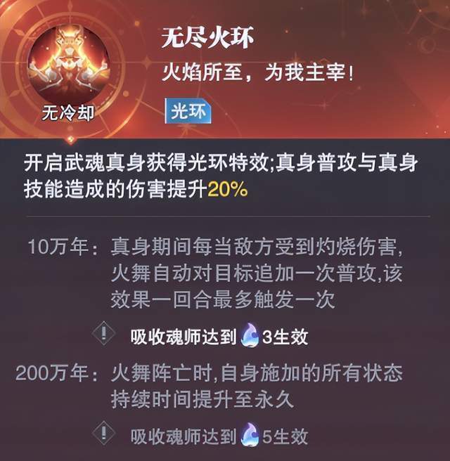 最后火舞真身光环的效果是可以追加普攻,这个追加的普攻倒是可以进一步来触发【灼烧】伤害,另外这个200万年的效果其实非常优秀,例如【火棘】增伤、【火舞耀阳】的增伤靠这个200万年的效果都应该可以持续全场,不过以目前我们的魂环条件来分析,200万年就是一个天文数字,暂时不用想......