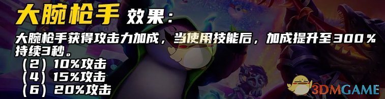 1、大腕枪手:获得攻击力加成,当使用技能后,加成提升至300%,持续3秒。