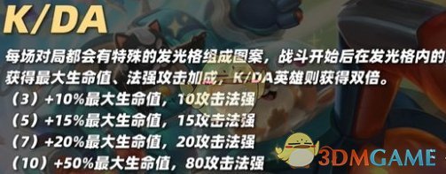 2、K/DA:每场对局都会有特殊的发光格组成国案,战斗开始后在发光格内的英雄获得最大生命值、法强攻击加成,K/DA英雄则获得双倍。