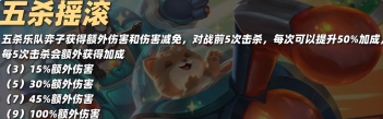 1、五杀摇滚:五杀乐队弈子获得额外伤害和伤害减免,对战前5次击杀,每次可以提升50%加成,每5次击杀会额外获得加成。