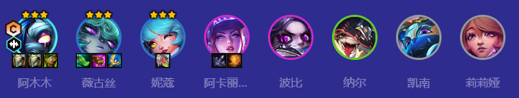 阿木木、薇古丝、妮惹、阿卡丽、波比、纳尔、凯南、莉莉娅