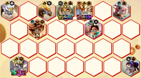 棋子组成:卡兹克、墨菲特、妮蔻、迦娜、索拉卡、戴安娜、李青、洛、悟空