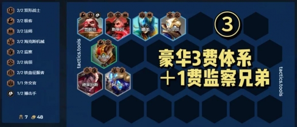 大多数羁绊追踪者都需要这三位棋子,在拿到他们三的情况下,补充监察/格斗等羁绊很容易就能开出八羁绊。