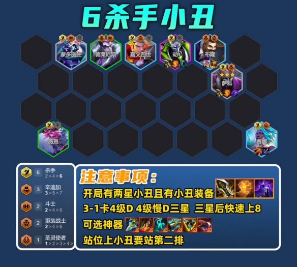 杀手羁绊:4/6杀手提供群体吸血与爆发增益,配合辛迪加的坦度与增伤,形成“切后排+持续输出”双体系。