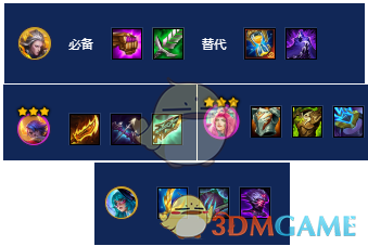 可酷伯作为主坦,配备蓝甲、龙牙、狂徒,前期蕾欧娜带肉装过渡。