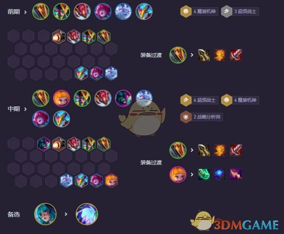 三源装备为脉冲稳定器时,龙女+蜘蛛替换成武器+猪妹。豹女/龙女/猫都是随缘三的,狗子三星后速升人口开5超频。开局有任一二星的三魔装+狗子+一件成装可以升人口走连胜,否则连败开局拿装备,优先拿大剑和拳套、水滴。