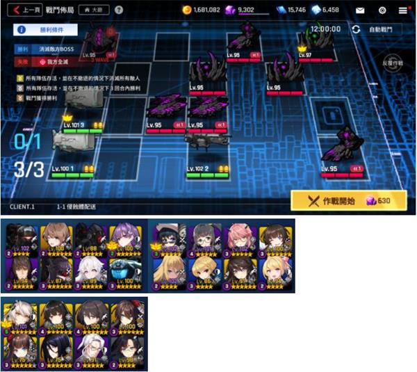 3队制裁者主力队,需要打BOSS,下A2位置,满级觉希带CD套,全程不死,甚至不需要其他前排也行,这队建议千夏或者修女提供大奶给师傅,后排输出自行选择。