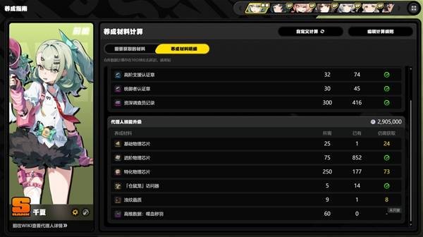 绝区零2.6版本正式更新,上半卡池中,全新角色千夏作为限定UP角色登场,作为妄想天使阵营的第一位角色,其人气相当高。其不错的技能机制也相当适配当前版本,是支援角色的不错选择,很多玩家想知道其养成材料,下面为大家带来材料数量汇总。