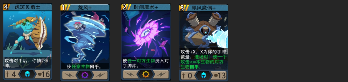 核心思路:当虎斑贝勇士占场时,以低费用回手卡回手虎斑贝对峙生物,保证抽卡效率。当卡组厚度不够,可加入魔法守卫,防止手牌自伤。