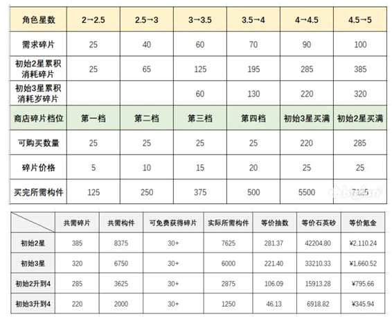 先来解释一下表格里的30个免费碎片从何而来。角色碎片本一共6关,首通打完只需要消耗30体力,就可以获得至少24个角色碎片,而打完6关的前置条件是亲密度LV6,LV6的亲密度又会送你6个碎片,可别忘了领哦~