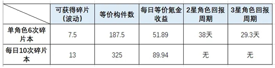 2星角色全部买碎片,最贵的档位购买的碎片数量除以每日获得的7.5个碎片得到的就是回报周期了。意思就是前面便宜的碎片全部买,后面价格最贵的碎片全部刷,刷到5星所需要的时间。3星角色同理。