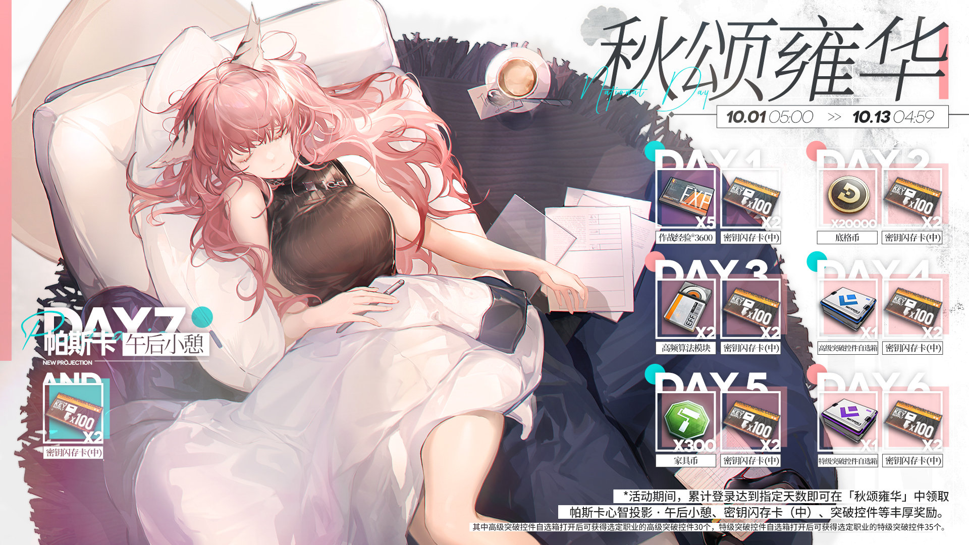 活动期间,累计登录达到指定天数即可在「秋颂雍华」中领取帕斯卡心智投影 · 午后小憩、密钥闪存卡(中)、突破控件等丰厚奖励!